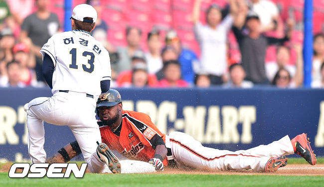 13일 오후 서울 잠실구장에서 열린 2014 한국야쿠르트 세븐 프로야구 두산 베어스와 한화 이글스의 경기,2회초 1사 1루 한화 김태완의 안타때 1루 주자 피에가 3루에 세이프되고 있다.