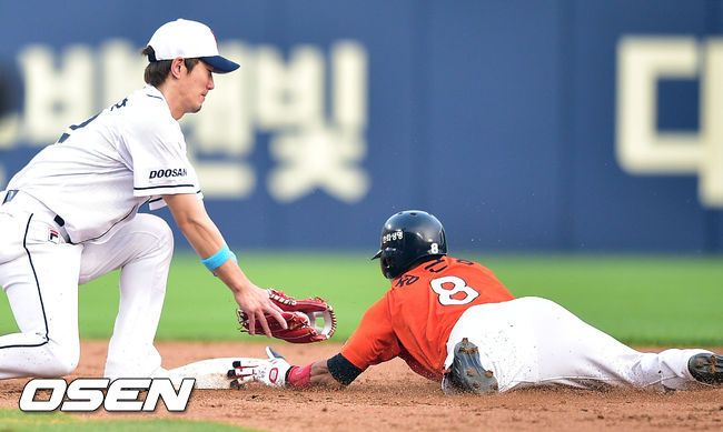 13일 오후 서울 잠실구장에서 열린 2014 한국야쿠르트 세븐 프로야구 두산 베어스와 한화 이글스의 경기,3회초 2사 2루 한화 김경언의 타석때 1루 주자 정근우가 2루 도루 성공하고 있다.