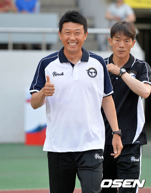 경기에 앞서 성남 이상윤 감독이 취재진을 향해 엄지를 들어 올리고 있다.