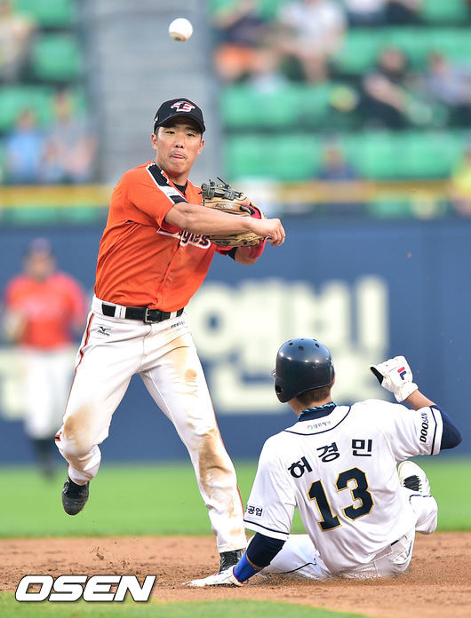 13일 오후 서울 잠실구장에서 열린 2014 한국야쿠르트 세븐 프로야구 두산 베어스와 한화 이글스의 경기,3회말 무사 1루 두산 김현수의 병살때 한화 정근우 2루수가 1루 주자 허경민을 포스아웃 시킨뒤 1루로 송구하고 있다.