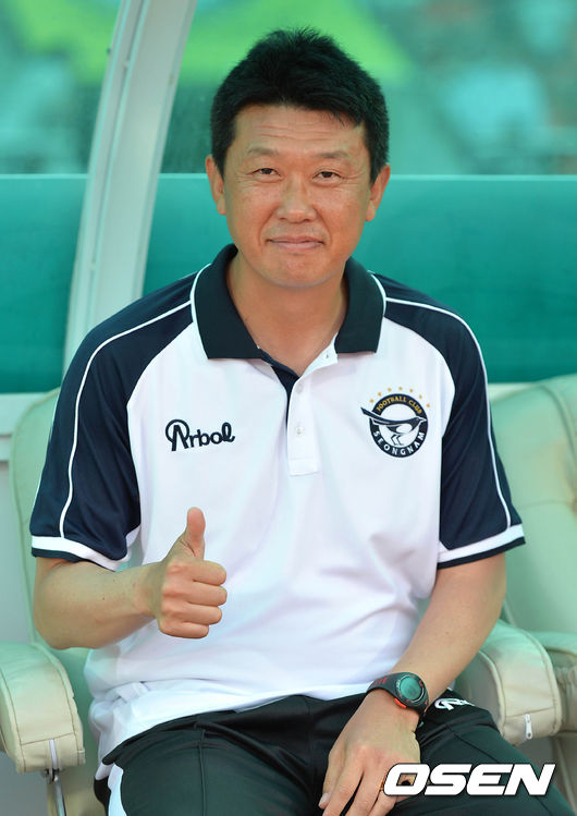 경기에 앞서 성남 이상윤 감독이 취재진을 향해 엄지를 들어 올리고 있다.
