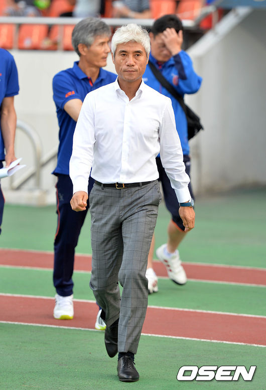 경기에 앞서 제주 박경훈 감독이 그라운드로 들어가고 있다.