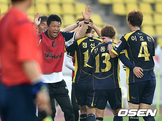 전반 성남 이상윤 감독대행이 김동희의 골에 환호하고 있다.