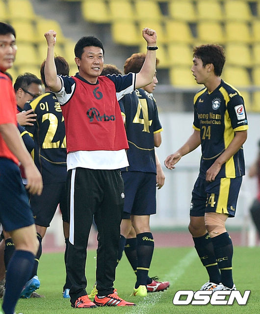 전반 성남 이상윤 감독대행이 김동희의 골에 환호하고 있다.