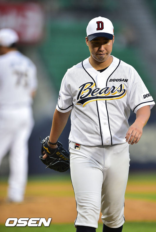 13일 오후 서울 잠실구장에서 열린 2014 한국야쿠르트 세븐 프로야구 두산 베어스와 한화 이글스의 경기,6회초 두산 유희관 선발투수가 교체되고 있다. 유희관은 5⅓이닝 1실점 호투했지만 8승 기회를 놓쳤다.
