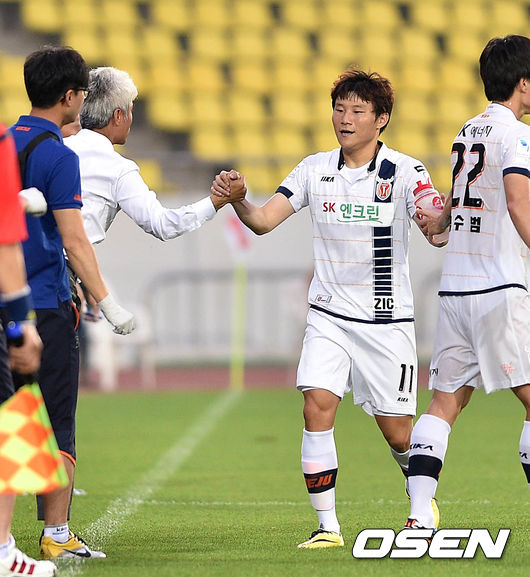 전반 제주 황일수가 골을 성공시키고 박성훈 감독과 하이파이브를 하고 있다.