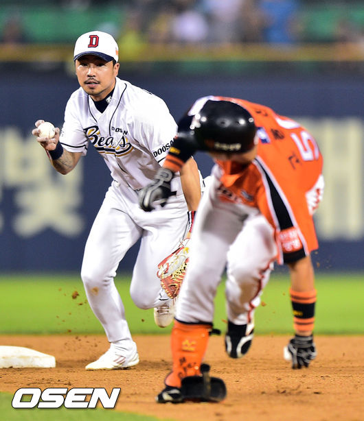 13일 오후 서울 잠실구장에서 열린 2014 한국야쿠르트 세븐 프로야구 두산 베어스와 한화 이글스의 경기 7회초 1사 1루 한화 고동진의 안타때 두산 오재원이 런다운 걸린 고동진을 태그아웃 시키고 있다