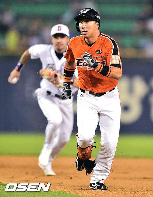 13일 오후 서울 잠실구장에서 열린 2014 한국야쿠르트 세븐 프로야구 두산 베어스와 한화 이글스의 경기 7회초 1사 1루 한화 고동진의 안타때 두산 오재원이 런다운 걸린 고동진을 태그아웃 시키고 있다