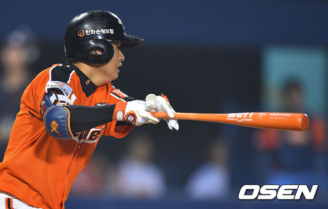 13일 오후 서울 잠실구장에서 열린 2014 한국야쿠르트 세븐 프로야구 두산 베어스와 한화 이글스의 경기 9회초 2사 2루 한화 이창열이 역전 3루타를 날리고 있다. 이창열을 이날 데뷔 첫 안타로 역전타를 신고했다.