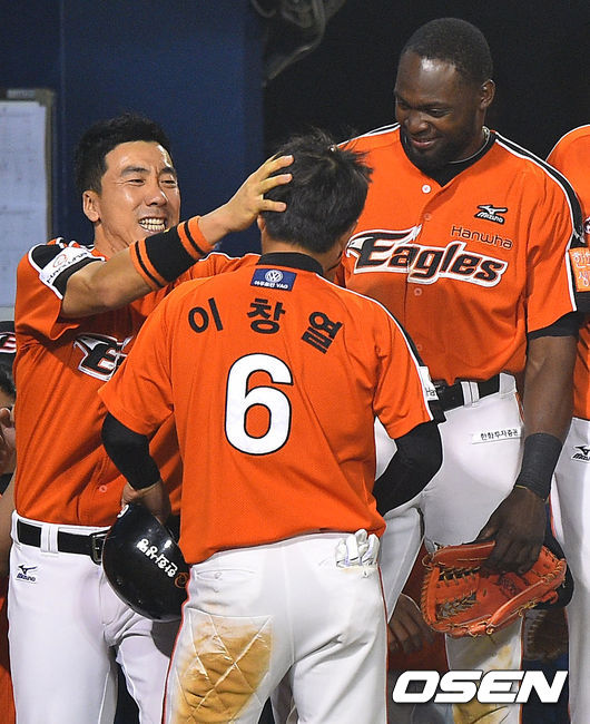 13일 오후 서울 잠실구장에서 열린 2014 한국야쿠르트 세븐 프로야구 두산 베어스와 한화 이글스의 경기 9회초 이닝종료 후 이창열이 동료들의 축하를 받고 있다. 이창열은 이날 데뷔 첫 안타로 역전타를 신고했다.