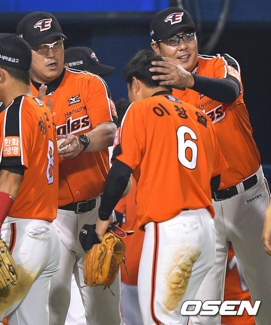 경기종료 후 정민철 코치와 장종훈 코치가 역전타를 날린 이창열을 격려하고 있다./ soul1014@osen.co.kr