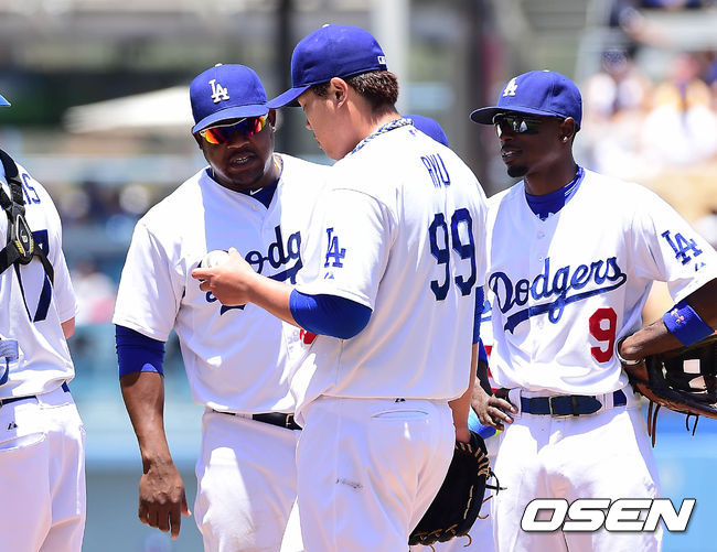 14일(한국시간) 미국 캘리포니아주 로스앤젤레스 다저스타디움에서 열린 '2014 메이저리그' LA 다저스와 샌디에이고 파드리스의 경기, 1회초 1사에서 다저스 류현진이 샌디에이고 헤들리의 타구를 맞자 마운드를 방문한 유리베가 류현진과 이야기를 나누고 있다.