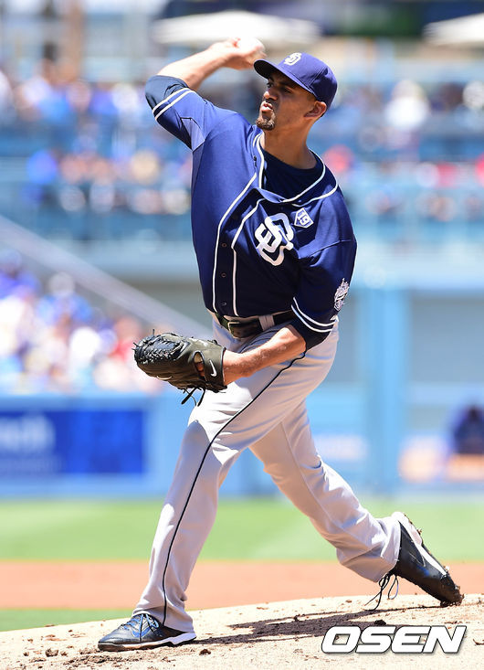 14일(한국시간) 미국 캘리포니아주 로스앤젤레스 다저스타디움에서 열린 '2014 메이저리그' LA 다저스와 샌디에이고 파드리스의 경기, 1회말 무사에서 샌디에이고 선발투수 타이슨 로스가 힘차게 공을 던지고 있다.