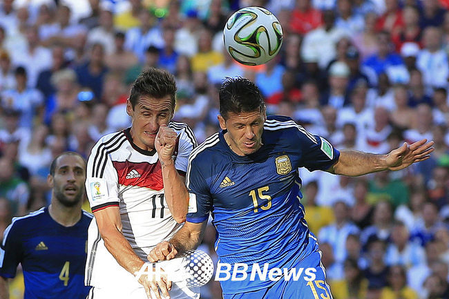 독일 클로제와 아르헨티나 데미첼리스가 헤딩 경합을 벌이고 있다.