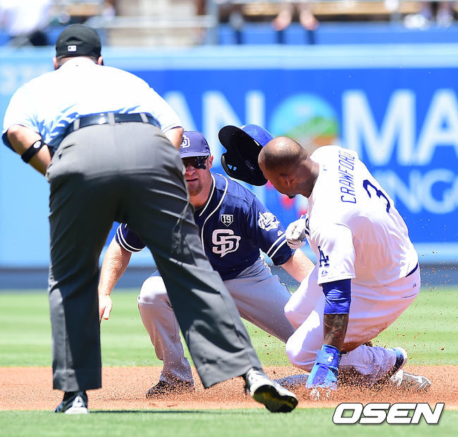 14일(한국시간) 미국 캘리포니아주 로스앤젤레스 다저스타디움에서 열린 '2014 메이저리그' LA 다저스와 샌디에이고 파드리스의 경기, 1회말 1사 1루 다저스 푸이그 타석때 1루주자 크로포드가 도루에 성공하고 있다.