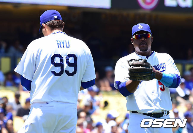 14일(한국시간) 미국 캘리포니아주 로스앤젤레스 다저스타디움에서 열린 '2014 메이저리그' LA 다저스와 샌디에이고 파드리스의 경기, 2회초 1사 샌디에이고 메이빈 타석때 마운드를 방문한 유리베가 류현진과 이야기를 나누고 있다.