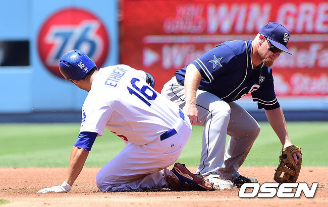 14일(한국시간) 미국 캘리포니아주 로스앤젤레스 다저스타디움에서 열린 '2014 메이저리그' LA 다저스와 샌디에이고 파드리스의 경기, 2회말 무사에서 다저스 이디어가 좌전 2루타를 치고 2루 슬라이딩을 하고 있다.