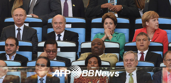 러시아 푸틴 대통령, 피파 블래터 회장, 독일 메르켈 총리등이 결승전을 찾아 경기를 관람하고 있다.