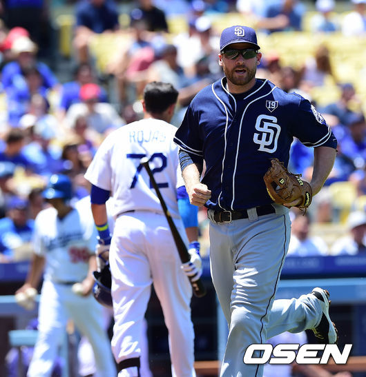 14일(한국시간) 미국 캘리포니아주 로스앤젤레스 다저스타디움에서 열린 '2014 메이저리그' LA 다저스와 샌디에이고 파드리스의 경기, 2회말 1사 1,3루에서 다저스 로하스가 더블아웃으로 물러나고 있다.