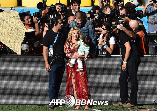 폐막식에 나선 가수 샤키라와 연인인 바르셀로나 피케가 아들과 함께 취재진의 시선을 사로잡고 있다.