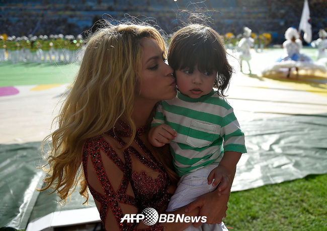 폐막식 무대에 오르는 샤키라가 아들에게 볼키스를 하고 있다.