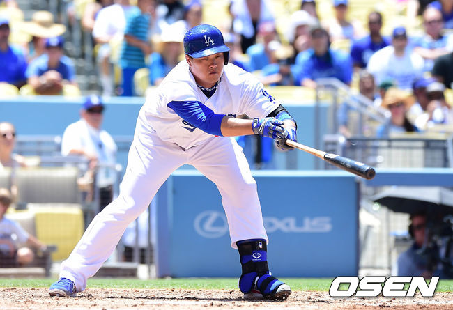 14일(한국시간) 미국 캘리포니아주 로스앤젤레스 다저스타디움에서 열린 '2014 메이저리그' LA 다저스와 샌디에이고 파드리스의 경기, 3회말 무사에서 다저스 류현진이 내야땅볼을 치고 있다.