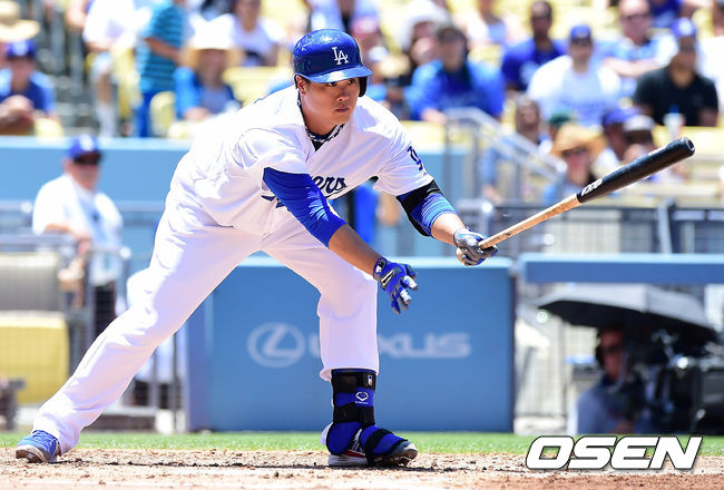 14일(한국시간) 미국 캘리포니아주 로스앤젤레스 다저스타디움에서 열린 '2014 메이저리그' LA 다저스와 샌디에이고 파드리스의 경기, 3회말 무사에서 다저스 류현진이 내야땅볼을 치고 있다.