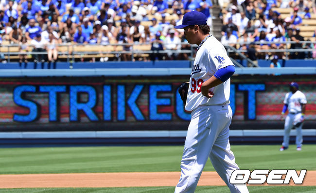 14일(한국시간) 미국 캘리포니아주 로스앤젤레스 다저스타디움에서 열린 '2014 메이저리그' LA 다저스와 샌디에이고 파드리스의 경기, 4회초 1사에서 다저스 류현진이 샌디에이고 헤들리를 삼진으로 처리하고 있다.