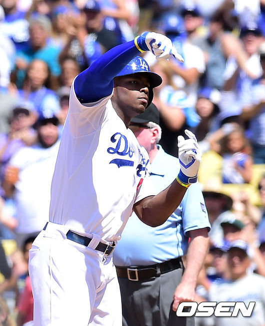 14일(한국시간) 미국 캘리포니아주 로스앤젤레스 다저스타디움에서 열린 '2014 메이저리그' LA 다저스와 샌디에이고 파드리스의 경기, 6회말 1사 1,2루에서 다저스 푸이그가 좌중간 적시타를 치고 환호하고 있다.