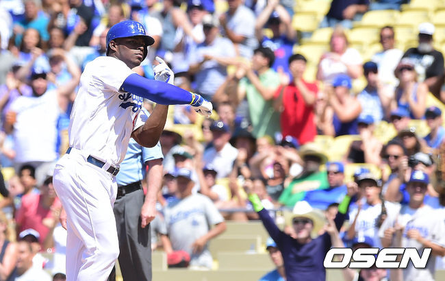 14일(한국시간) 미국 캘리포니아주 로스앤젤레스 다저스타디움에서 열린 '2014 메이저리그' LA 다저스와 샌디에이고 파드리스의 경기, 6회말 1사 1,2루에서 다저스 푸이그가 좌중간 적시타를 치고 환호하고 있다.