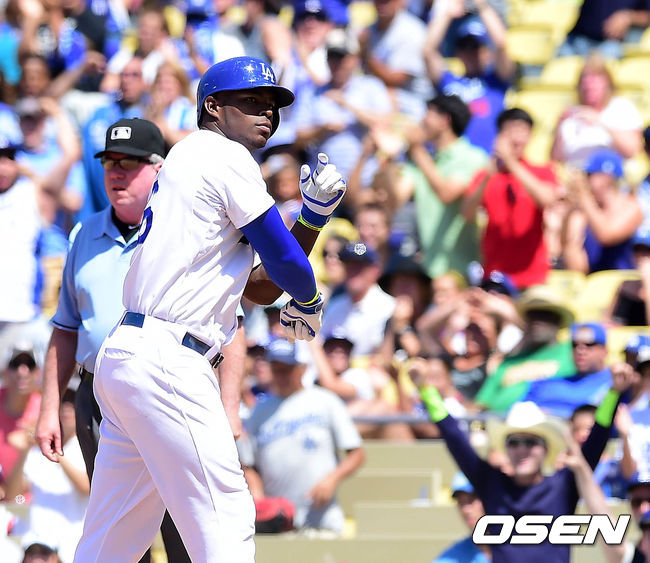14일(한국시간) 미국 캘리포니아주 로스앤젤레스 다저스타디움에서 열린 '2014 메이저리그' LA 다저스와 샌디에이고 파드리스의 경기, 6회말 1사 1,2루에서 다저스 푸이그가 좌중간 적시타를 치고 환호하고 있다.