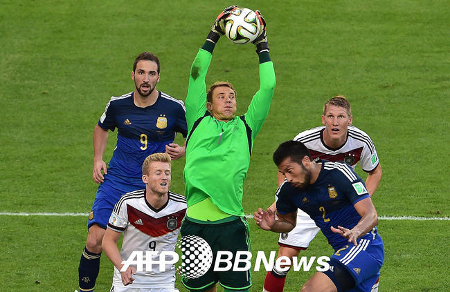 독일 노이어 골키퍼가 아르헨티나 가라이보다 앞서 공중볼을 잡아내고 있다./photo@osen.co.kr