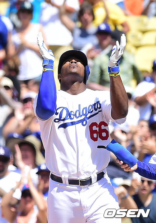 14일(한국시간) 미국 캘리포니아주 로스앤젤레스 다저스타디움에서 열린 '2014 메이저리그' LA 다저스와 샌디에이고 파드리스의 경기, 6회말 1사 1,2루에서 다저스 푸이그가 좌중간 적시타를 치고 환호하고 있다.