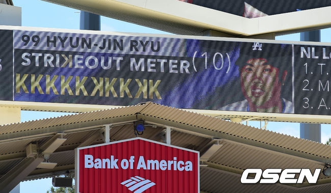14일(한국시간) 미국 캘리포니아주 로스앤젤레스 다저스타디움에서 열린 '2014 메이저리그' LA 다저스와 샌디에이고 파드리스의 경기, 6회초 1사 1루 전광판에 다저스 류현진의 삼진 기록이 찍혀 있다.