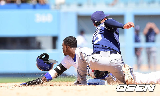 14일(한국시간) 미국 캘리포니아주 로스앤젤레스 다저스타디움에서 열린 '2014 메이저리그' LA 다저스와 샌디에이고 파드리스의 경기, 6회말 1사 1루에서 다저스 크로포드 타석때 1루주자 고든이 도루에 성공하고 있다.