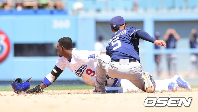 14일(한국시간) 미국 캘리포니아주 로스앤젤레스 다저스타디움에서 열린 '2014 메이저리그' LA 다저스와 샌디에이고 파드리스의 경기, 6회말 1사 1루에서 다저스 크로포드 타석때 1루주자 고든이 도루에 성공하고 있다.