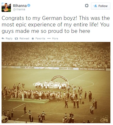 유명 가수 리한나가 2014 브라질 월드컵 우승팀 독일 대표팀에 축하인사를 보냈다.