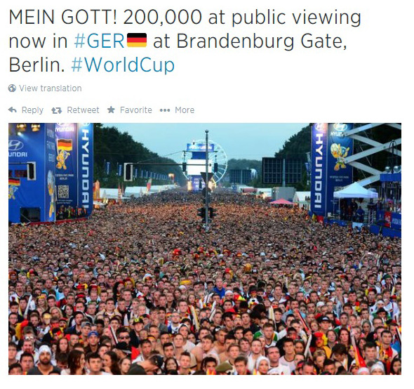 연장전 마리오 괴체의 슛이 터졌을 때 엄청난 함성이 쏟아졌다. 흥분한 팬들은 “괴체는 축구의 신”이라고 연호했다고 한다. 월드컵 우승이 확정되자 분위기는 절정에 이르렀다. 광장에서는 폭죽이 터졌고, 팬들은 브란덴부르크문까지 개선행진을 펼쳤다. 그야말로 독일 전체가 광란에 휩싸였다.