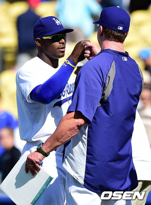 승리를 거둔 다저스 푸이그가 맥과이어 코치와 하이파이브을 하고 있다./youngrae@osen.co.kr