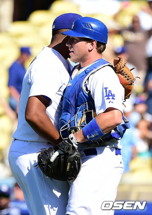 9회초 마운드에 올라 세이브를 올린 젠슨이 A.J 엘리스와 기뻐하고 있다./youngrae@osen.co.kr