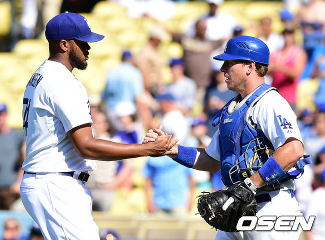 9회초 마운드에 올라 세이브를 올린 젠슨이 A.J 엘리스와 기뻐하고 있다./youngrae@osen.co.kr