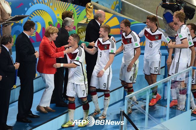 시상식 행사에서 독일 선수들이 앙겔라 메르켈 독일 총리로 부터 축하를 받고 있다./photo@osen.co.kr