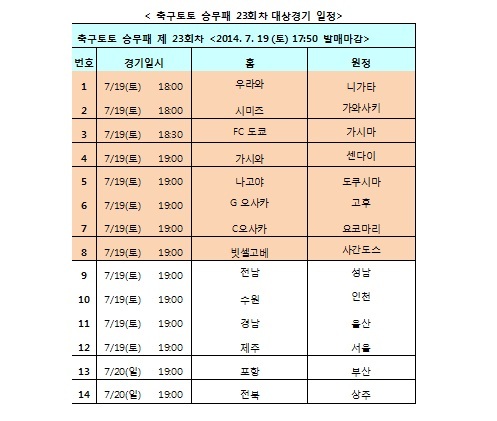 국민체육진흥공단(www.kspo.or.kr)이 발행하는 체육진흥투표권 수탁사업자인 스포츠토토(www.sportstoto.co.kr)는 오는 19일(토)과 20일(일)에 벌어지는 일본프로축구(J리그) 8경기 및 K리그 클래식 6경기 등 총 14경기를 대상으로 한 축구토토 승무패 23회차 게임을 발행한다고 밝혔다.