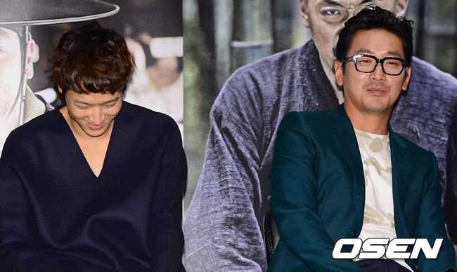 14일 오후 서울 삼성동 메가박스 코엑스에서 열린 영화 '군도: 민란의 시대'(이하 군도) 언론배급시사회에서 배우 강동원과 하정우가 미소를 짓고 있다.