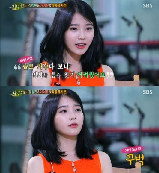 아이유는 14일 오후 방송된 SBS 예능프로그램 '힐링캠프-기쁘지 아니한가'에서 "인사를 하지 않는다는 말이 있다"는 MC 이경규의 말에 "솔로 가수다 보니 인사할 틈을 찾기가 어려웠다"고 말했다.