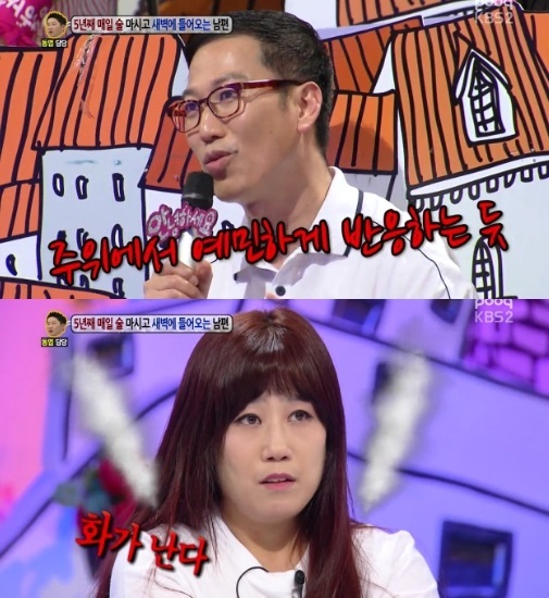 14일 방송된 KBS 2TV 예능프로그램 '대국민 토크쇼 안녕하세요'에서는 5년째 매일 술을 마시고 새벽에 들어오는 남편이 고민인 아내가 등장했다.