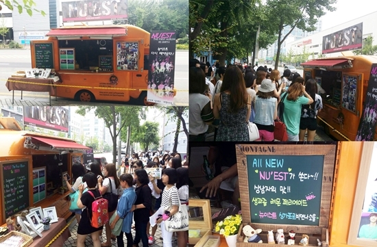뉴이스트의 팬들은 지난 13일 SBS ‘인기가요’의 첫 방송 무대 방청을 위해 현장에서 대기 중이었던 또 다른 팬들에게 이색 조공을 진행했다. 이날 뉴이스트의 싱가포르 팬들이 한국의 팬들을 위해 티 트럭을 보내 온 것.