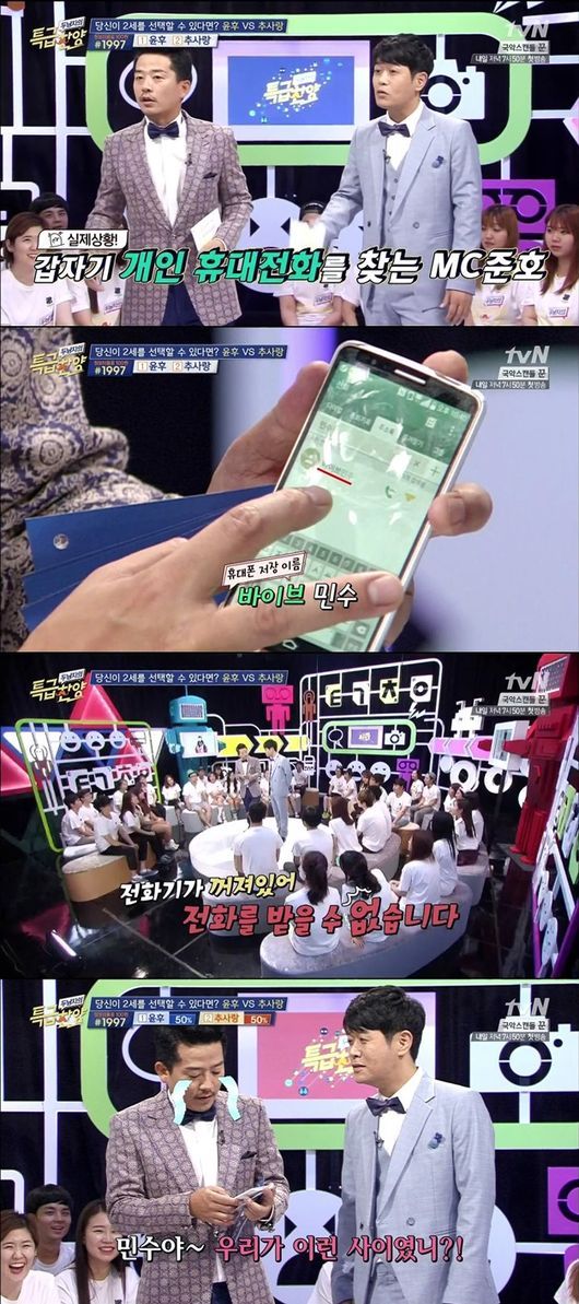 하지만 김준호가 건 윤민수의 폰에서는 '전화기가 꺼져있어'라는 메시지가 나왔고, 자신만만해 하던 김준호는 얼굴까지 빨개지며 부끄러워해 방청객들에게 실망과 웃음을 동시에 안겨줬다.