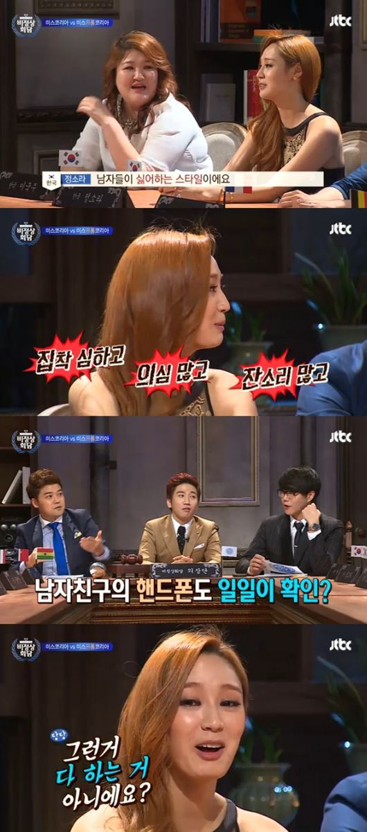 이어 “집착심하고 의심 많고 잔소리 많다”고 말했고 전현무가 “남자친구 휴대폰 내용도 다 보냐”고 물었다. 이에 정소라는 “그런거 다 하는 거 아니냐”며 “문자, 전화내용 다 공유한다”고 말해 패널들을 놀라게 했다.