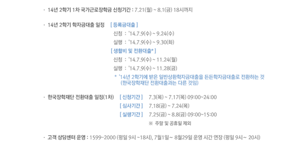 또한 학자금대출은 등록금 대출과 생활비 및 전환대출로 구분된다. 자세한 것은 고객 상담센터(1599-2000)를 통해 상담 가능하다.